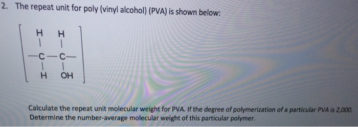 If the degree of polymerization of a particular pva is 2 000. Poly vinyl alcohol is a synthetic polymer bearing repeating ch 2 ch oh units which is generally prepared from post polymerization reaction of a homopolymer obtained from a protected monomer such as vinyl acetate. Poly vinyl alcohol pva is recognized as one of the very few vinyl polymers soluble in water also susceptible of ultimate biodegradation in the presence of suitably acclimated microorganisms. Poly vinyl alcohol is completely water soluble and thus is used as a thickener in some suspensions and emulsions.